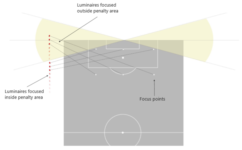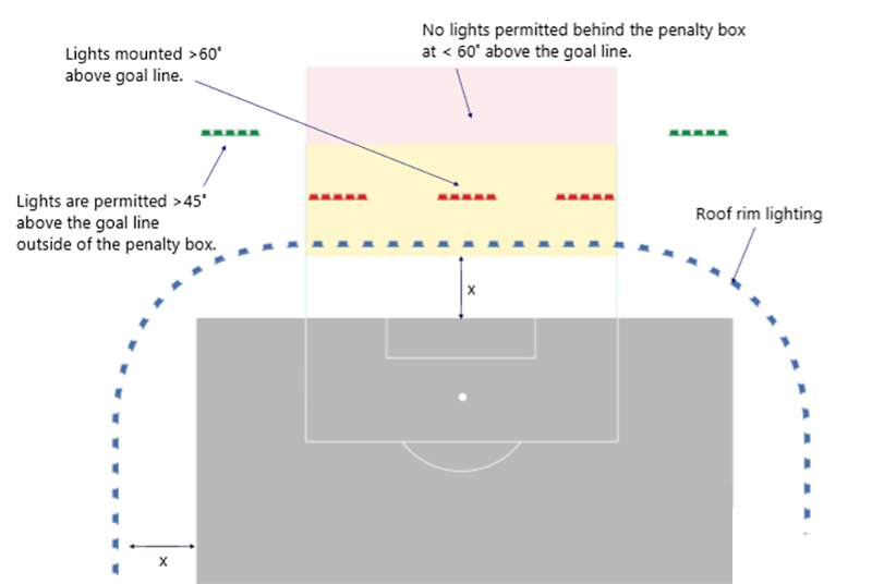 O ângulo de projeção das lâmpadas na área atrás do gol não pode ser projetado na área restrita e no campo, mas pode ser projetado no campo fora da linha de fundo, para que não interfira nos atletas.