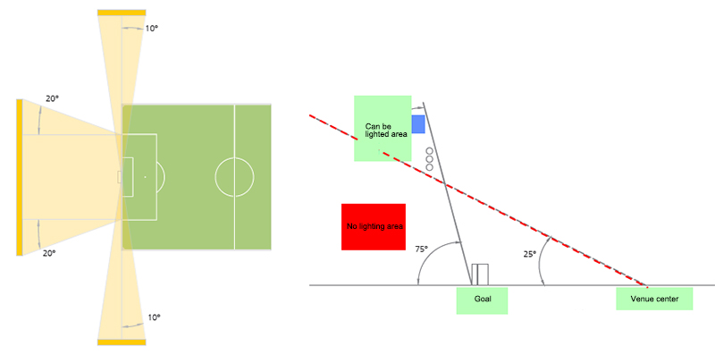 Há um mal-entendido na iluminação do campo de futebol. Existem algumas áreas onde as luminárias esportivas são proibidas. As áreas principais são 15 graus (com transmissão de TV) ou 10 graus (sem transmissão de TV) em ambos os lados da linha de fundo e o alcance abaixo do ângulo de elevação de 60 graus atrás do gol. Do padrão FIFA 2002 (FIFA), ao padrão FIFA 2007, e depois ao padrão FIFA 2011, após várias revisões, os requisitos para áreas de iluminação proibidas tornaram-se cada vez mais rigorosos, conforme mostrado nas Figuras 1 a 3 . os padrões do meu país também adotaram os requisitos padrão da FIFA e continuam até hoje.